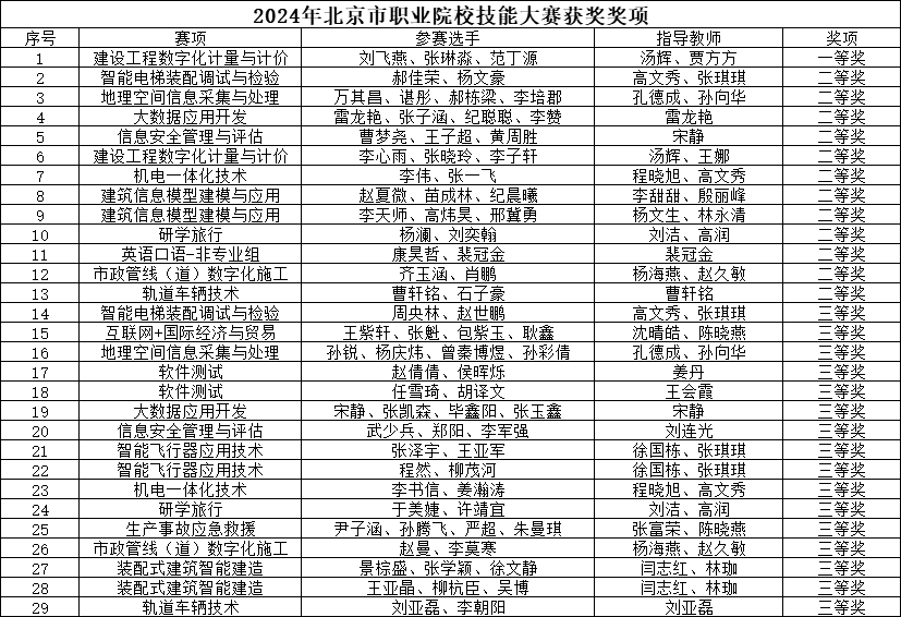2024年1月至6月,历时半年的北京市职业院校技能大赛落下帷幕。学院共组织31支代表队,参加16个赛项,取得了1个一等奖、12个二等奖、16个三等奖的优异成绩。其中,地理空间信息采集与处理、建设工程数字化计量与计价、机电一体化技术、建筑信息模型建模与应用4项比赛获得全国职业院校技能大赛参赛资格,届时他们将代表北京市职业院校参赛。